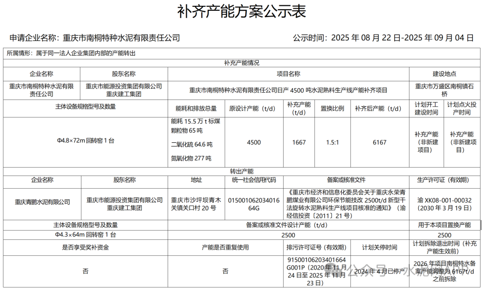 公示表中顯示,重慶市南桐特種水泥補(bǔ)充熟料產(chǎn)能1667t/d,退出產(chǎn)能2500t/d來(lái)自重慶青鵬水泥,置換比例1.5:1。