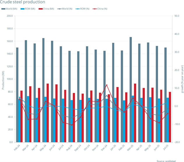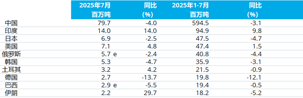 2025年7月全球70個(gè)納入世界鋼鐵協(xié)會(huì)統(tǒng)計(jì)國家/地區(qū)的粗鋼產(chǎn)量為1.501億噸,同比下降1.3%。