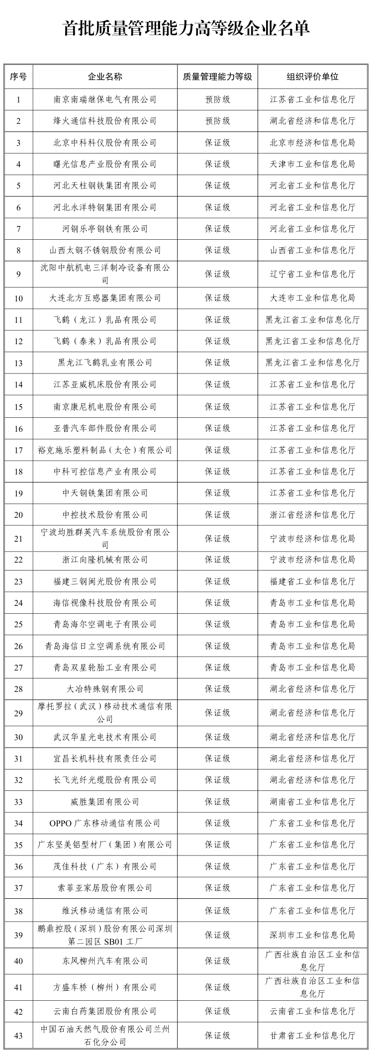 為落實《制造業(yè)卓越質(zhì)量工程實施意見》(工信部聯(lián)科〔2023〕249號)和《工業(yè)和信息化部辦公廳關(guān)于開展2024年制造業(yè)企業(yè)質(zhì)量管理能力評價工作的通知》(工信廳科函〔2024〕160號),經(jīng)自評價、評價復(fù)核、二次復(fù)核、征求意見、社會公示,我部確定了首批43家質(zhì)量管理能力高等級企業(yè)名單,現(xiàn)予以公布。
