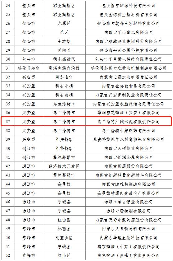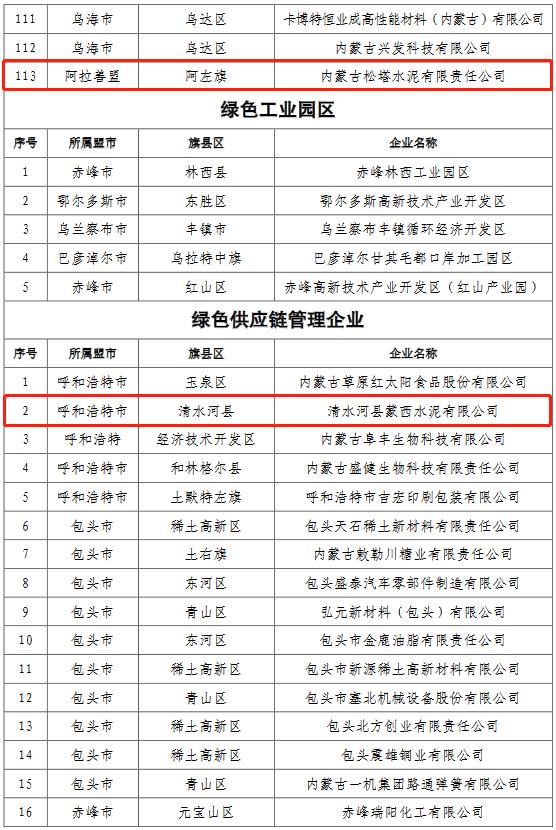 7月9日,內(nèi)蒙古工信廳公示了《2024年自治區(qū)級(jí)綠色制造示范單位》。根據(jù)公示名單,烏蘭浩特紅城水泥有限責(zé)任公司、內(nèi)蒙古松塔水泥有限責(zé)任公司入選綠色工廠名單,清水河縣蒙西水泥有限公司入選綠色供應(yīng)鏈管理企...7月9日,內(nèi)蒙古工信廳公示了《2024年自治區(qū)級(jí)綠色制造示范單位》。根據(jù)公示名單,烏蘭浩特紅城水泥有限責(zé)任公司、內(nèi)蒙古松塔水泥有限責(zé)任公司入選綠色工廠名單,清水河縣蒙西水泥有限公司入選綠色供應(yīng)鏈管理企業(yè)名單。