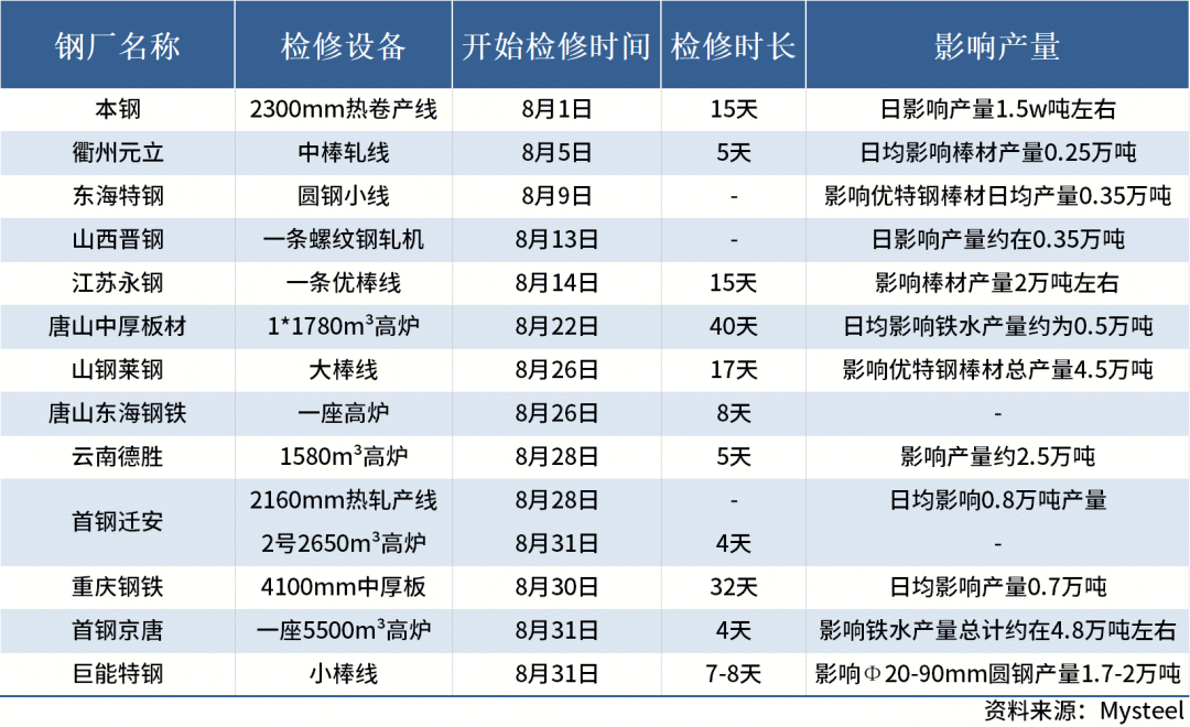 據(jù)Mysteel不完全統(tǒng)計(jì),8月以來國內(nèi)13家鋼廠發(fā)布檢修信息,其中,首鋼京唐計(jì)劃于8月31日對(duì)一座5500m3高爐進(jìn)行檢修至9月3日結(jié)束,為期4天左右,影響鐵水產(chǎn)量總計(jì)約在4.8萬噸左右。具體情況如下: