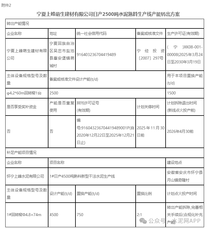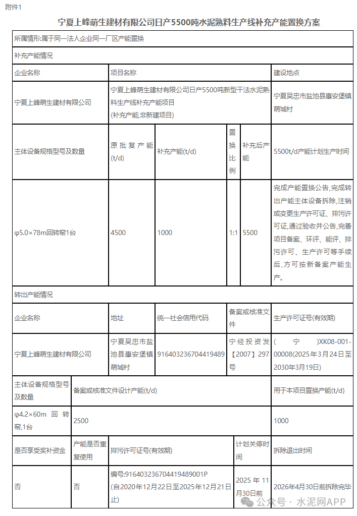 9月3日,寧夏工業(yè)廳發(fā)布“關(guān)于寧夏上峰萌生建材有限公司水泥熟料生產(chǎn)線補(bǔ)足產(chǎn)能置換和產(chǎn)能轉(zhuǎn)出方案的公示”。