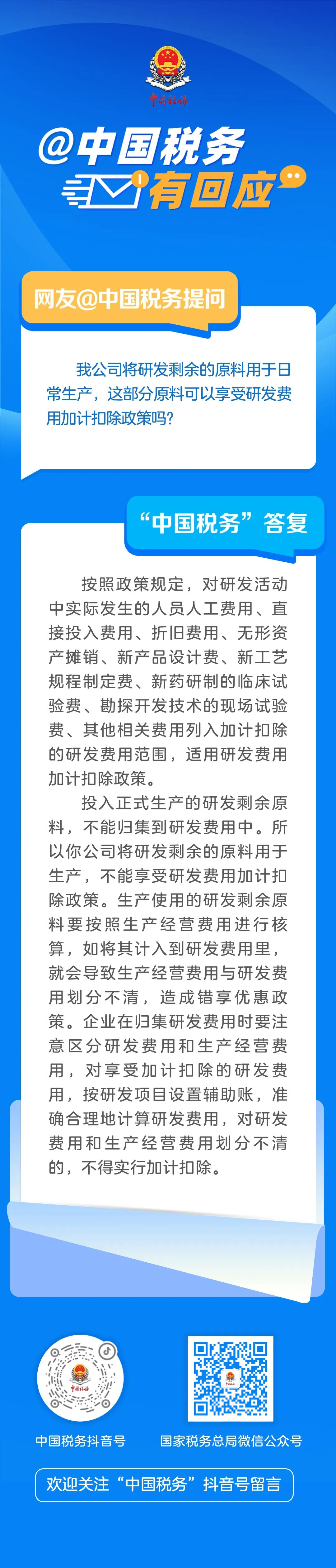 有網(wǎng)友問:“我公司將研發(fā)剩余的原料用于日常生產(chǎn),這部分原料可以享受研發(fā)費(fèi)用加計(jì)扣除政策嗎?”一起來(lái)看看回復(fù)吧↓