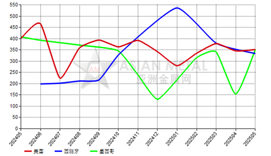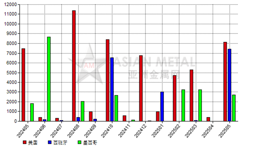 2025年5月,巴西鎂砂前三大出口目的國(guó)為美國(guó)、西班牙和墨西哥。