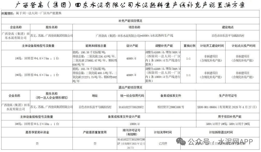 方案顯示,廣西登高(集團(tuán))田東水泥1#、2#4000t/d生產(chǎn)線各補(bǔ)充產(chǎn)能500t/d,退出產(chǎn)能來自同公司3#1000生產(chǎn)線,置換比例1:1。