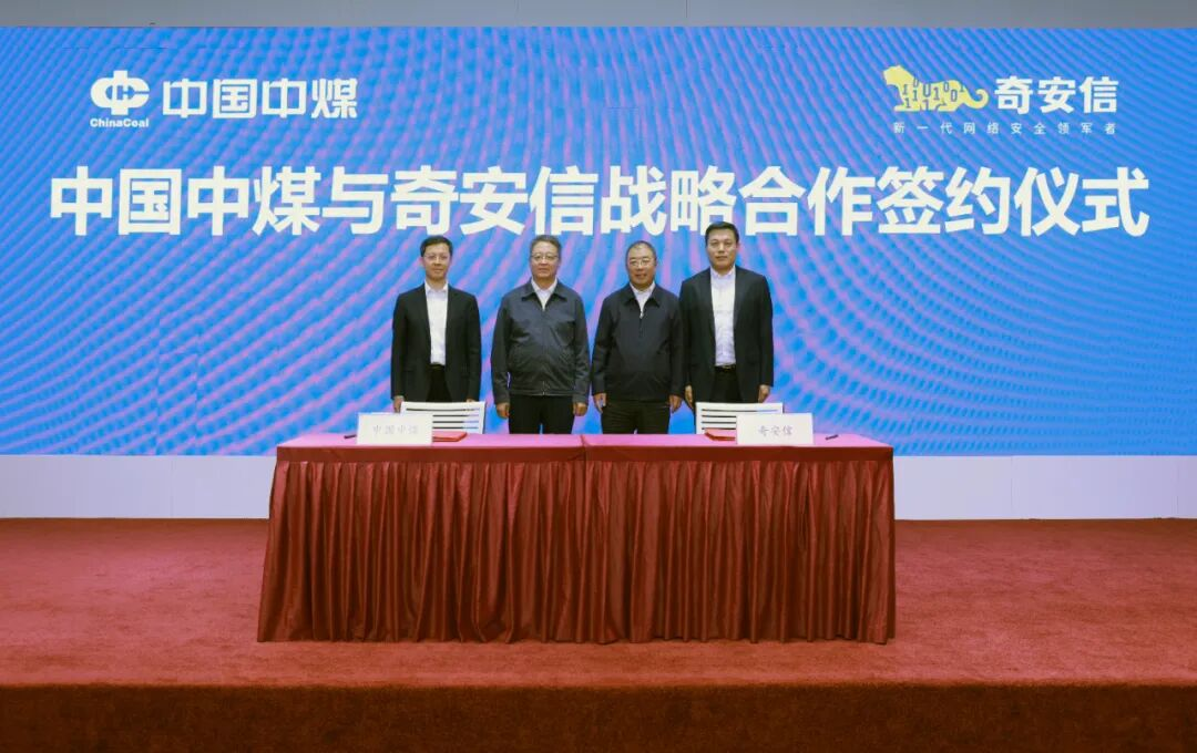 10月9日,中國(guó)中煤與奇安信集團(tuán)在京簽署戰(zhàn)略合作協(xié)議。中國(guó)中煤黨委書(shū)記、董事長(zhǎng)王樹(shù)東與奇安信集團(tuán)黨委書(shū)記、董事長(zhǎng)齊向東舉行工作會(huì)談并見(jiàn)證簽約。中國(guó)中煤黨委常委、副總經(jīng)理倪嘉宇,奇安信集團(tuán)高級(jí)副總裁吳登峰分別代表雙方簽署協(xié)議。奇安信集團(tuán)副總裁唐皓參加活動(dòng)。