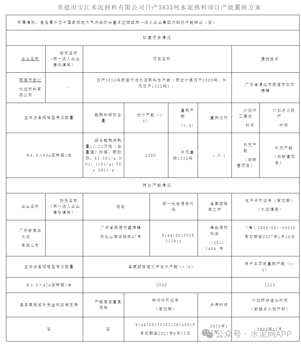 置換方案顯示,英德市寶江水泥2500t/d生產(chǎn)線補充產(chǎn)能1333t/d,補充后產(chǎn)能達3833t/d,退出產(chǎn)能來自廣東新南華水泥有限公司一條2000t/d生產(chǎn)線,置換比例1.5:1。
