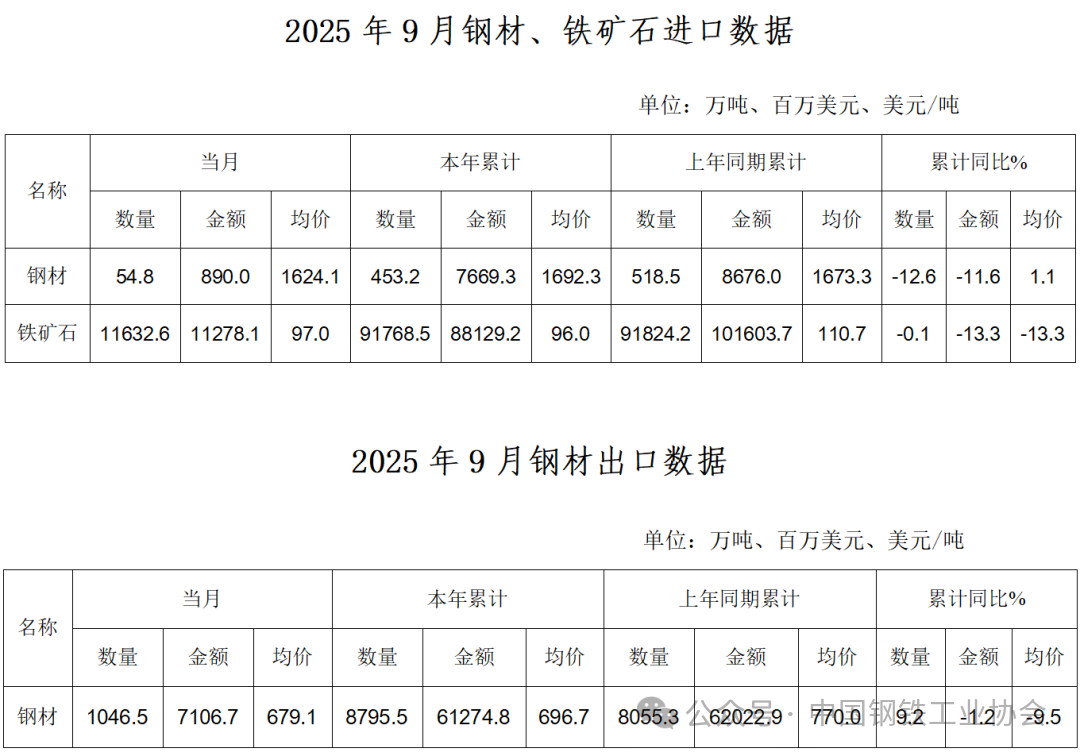 根據(jù)海關(guān)統(tǒng)計快訊數(shù)據(jù),2025年9月,我國進(jìn)口鋼材54.8萬噸,環(huán)比增加4.8萬噸、增幅9.6%;均價1624.1美元/噸,環(huán)比下跌27.5美元/噸、降幅1.7%。1-9月累計進(jìn)口鋼材453.2萬噸,同比減少65.3萬噸、降幅12.6%。2025年9月,我國進(jìn)口鐵礦石11632.6萬噸,環(huán)比增加1110.1萬噸、增幅10.5%;均價97.0美元/噸,環(huán)比上漲4.2美元/噸、漲幅4.6%。1-9月累計進(jìn)口鐵礦石91768.5萬噸,同比減少55.7萬噸、降幅0.1%。2025年9月,我國出口鋼材1046.5萬噸,環(huán)比增加95.5萬噸、增幅10.0%;均價679.1美元/噸,環(huán)比下跌18.9美元/噸、跌幅2.7%。1-9月累計出口鋼材8795.5萬噸,同比增加740.2萬噸、增幅9.2%。