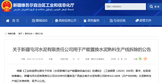 10月14日,新疆工信廳發(fā)布公告稱,根據(jù)《工業(yè)和信息化部關(guān)于印發(fā)〈水泥玻璃行業(yè)產(chǎn)能置換實(shí)施辦法〉的通知》(工信部原〔2024〕206號(hào))要求,經(jīng)現(xiàn)場(chǎng)核查確認(rèn),新疆屯河水泥有限責(zé)任公司2020年9月置換至廣西崇左南方水泥有限公司的Φ4.6×68米(日產(chǎn)4000噸)水泥熟料生產(chǎn)線已關(guān)停拆除。