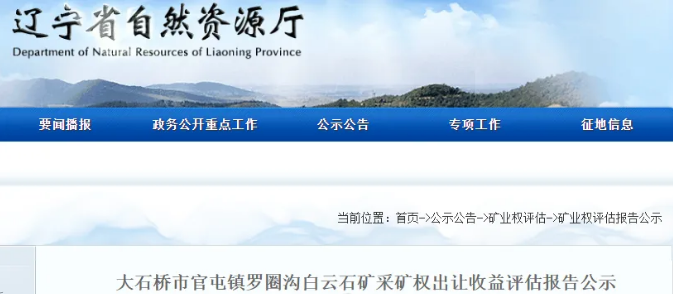 大石橋市官屯鎮(zhèn)羅圈溝白云石礦采礦權(quán)出讓收益評估報(bào)告通過遼寧省自然資源廳門戶網(wǎng)站向社會公示,公示10個(gè)工作日。如有異議,請于公示之日起10個(gè)工作日內(nèi)以電話方式先向省自然資源廳礦產(chǎn)資源保護(hù)監(jiān)督處提出簡要意見,隨后及時(shí)將書面意見反饋到省自然資源廳礦產(chǎn)資源保護(hù)監(jiān)督處。