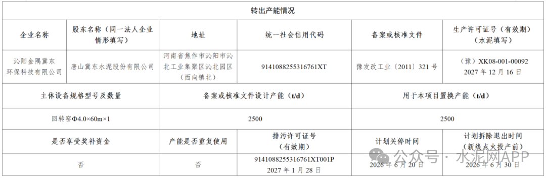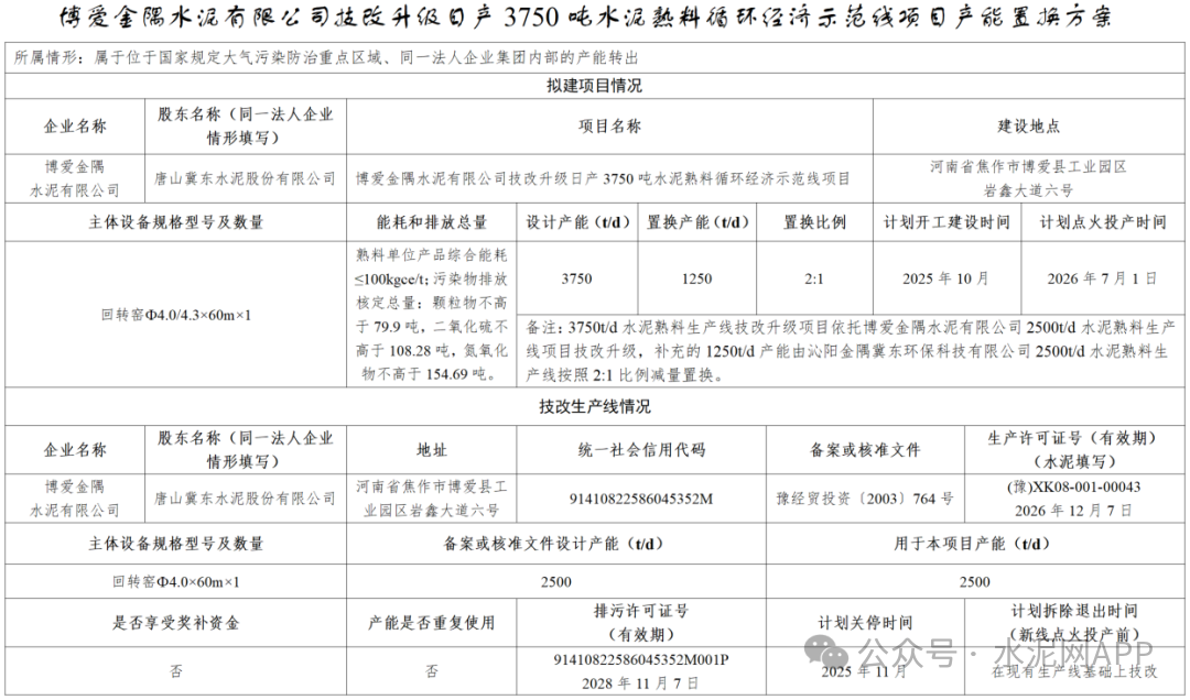 置換方案顯示,博愛金隅3750t/d水泥熟料生產(chǎn)線技改升級項目依托博愛金隅水泥有限公司2500t/d水泥熟料生產(chǎn)線項目技改升級,補充的1250t/d產(chǎn)能由沁陽金隅冀東環(huán)保科技有限公司2500t/d水泥熟料生產(chǎn)線按照2:1比例減量置換。