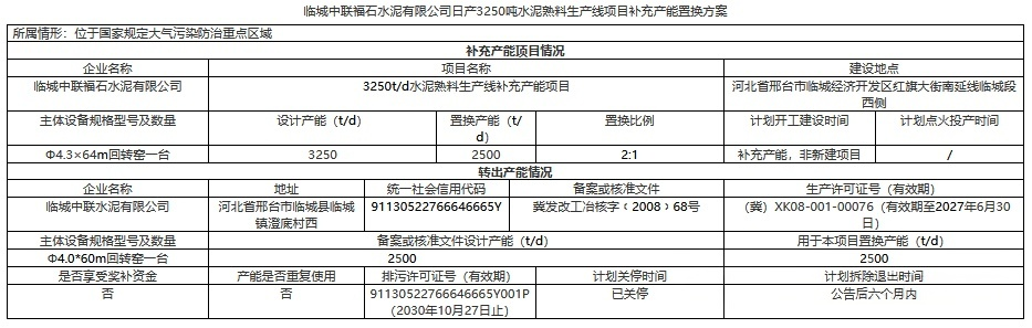 置換方案顯示,臨城中聯(lián)水泥有限公司出讓2500t/d產(chǎn)能至臨城中聯(lián)福石水泥有限公司。