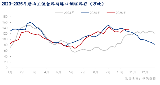 調(diào)研截止至10月23日鋼坯倉儲庫存總量達(dá)150.74萬噸,較上周小幅增加0.29萬噸。從區(qū)域分布來看,唐山地區(qū)庫存占比最高,達(dá)134.13萬噸;天津地區(qū)為0.4萬噸,江蘇地區(qū)則為16.21萬噸。2025年全國鋼坯社會庫存整體呈現(xiàn)“南低北高”格局,庫存去化節(jié)奏緩慢,市場整體承壓明顯,其中唐山市場的社會庫存占比較高。以唐山市場為例,2025年鋼坯庫存隨季節(jié)與需求變化呈現(xiàn)明顯波動:春節(jié)臨近下游調(diào)坯廠逐步進(jìn)入假期,市場需求持續(xù)走弱,鋼坯庫存進(jìn)入累庫周期,春節(jié)期間日均累庫量約1.9萬噸。春節(jié)后下游調(diào)坯廠利潤改善,開工率與產(chǎn)能利用率同步提升,帶動鋼坯需求增長,社會庫存隨之下降。從庫存周期看,2025年上半年鋼坯市場呈現(xiàn)典型的“主動去庫”特征:貿(mào)易商基于謹(jǐn)慎預(yù)期維持低庫存,供應(yīng)緊張則強(qiáng)化了這一趨勢。進(jìn)入下半年,市場轉(zhuǎn)向“被動累庫”,其核心驅(qū)動力是下游利潤惡化引發(fā)的需求收縮,導(dǎo)致鋼坯在需求不暢中持續(xù)積壓。