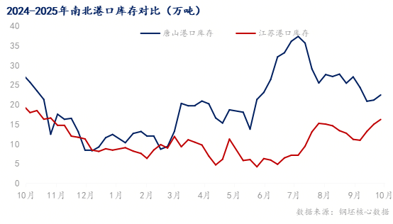 唐山港口鋼坯庫存22.45萬噸,周環(huán)比增加1.3萬噸,較上月同期減少4.6萬噸,較去年同減少5.13萬噸。華東地區(qū)主流港口鋼坯庫存16.21萬噸,周環(huán)比增加1.22萬噸,較上月同期增加5.06萬噸,較去年同減少3.58萬噸。從目前來看,南北港口本周均呈“周環(huán)比增長”,短期累庫屬于區(qū)域供需節(jié)奏性調(diào)整,并非趨勢性壓力。中長期來看北方唐山港口庫存供需結(jié)構(gòu)更優(yōu),庫存壓力持續(xù)緩解;華東港口雖年度壓力減輕,但本月需求釋放弱于北方,短期庫存消化壓力略高于唐山。