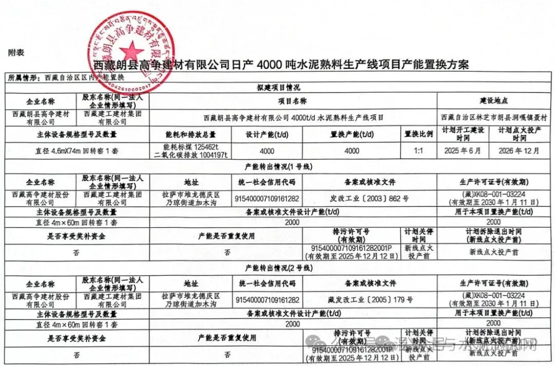 西藏朗縣高爭建材有限公司將1:1等量置換建設(shè)4000t/d水泥熟料生產(chǎn)線項目;建設(shè)地點為西藏自治區(qū)林芝市朗縣洞嘎鎮(zhèn)聶村;主體設(shè)備型號和數(shù)量為直徑4.6mX74m回轉(zhuǎn)窯1套;設(shè)計產(chǎn)能為4000t/d水泥熟料(年產(chǎn)120萬噸水泥熟料);能耗總量為125462t標煤(當量值,不含礦山開采)、二氧化碳排放總量為1004197t,擬建生產(chǎn)線按照能效標桿水平和環(huán)??冃級水平建設(shè),主要用能設(shè)備達到能效先進水平。預計2026年12月點火投產(chǎn)。