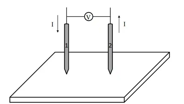 1、兩探針?lè)▋商结樂(lè)ㄓ址Q(chēng)歐姆表法,是一種結(jié)構(gòu)簡(jiǎn)單的電阻率測(cè)量方法。如下圖所示,兩個(gè)探針與恒流源和電壓表連接。由恒流源輸出一個(gè)恒定電流,電壓表測(cè)量?jī)蓚€(gè)探針間的電壓,然后由歐姆定律得出電阻值。兩探針?lè)ǘ嘤糜诖箅娮韬途纫蟛桓叩那闆r,其原因在于導(dǎo)線、探針以及探針與樣品的接觸電阻等附加電阻通常在歐姆量級(jí),對(duì)于大電阻測(cè)量來(lái)說(shuō)附加電阻相對(duì)較小,對(duì)最終的結(jié)果影響有限。然而對(duì)于小電阻而言,附加電阻與被測(cè)樣品阻值接近甚至高于被測(cè)樣品阻值,因此其附加電阻會(huì)導(dǎo)致相當(dāng)大的測(cè)量誤差。
