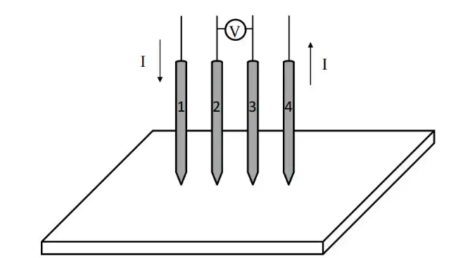 2、四探針?lè)ㄡ槍?duì)兩探針?lè)椒ǖ姆N種不足,開(kāi)爾文男爵發(fā)展了四探針技術(shù)。其工作原理如下圖所示,通常四個(gè)探針沿一條直線等間距排列,外側(cè)兩個(gè)探針(探針 1 和 4)傳輸電流,內(nèi)側(cè)兩個(gè)探針測(cè)量電壓。恒流源輸出電流 I 到探針 1,電流流經(jīng)樣品后經(jīng)探針4 流出形成電流回路。探針 2 和 3 連接電壓表,測(cè)量探針兩端的電壓,形成電壓回路。電流和電壓測(cè)量不共用探針,而是由各自的一對(duì)探針形成回路。根據(jù)歐姆定律可得到樣品的電阻值。電壓表的內(nèi)阻通常在 109 ? 以上,因此流過(guò)電壓探針 2 和 3 的電流接近零,因此探針 2 和 3 自身電阻產(chǎn)生的電壓降也接近零,可以忽略。這樣就規(guī)避了導(dǎo)線電阻、探針電阻以及探針與材料的接觸電阻的影響,因此四探針?lè)椒ū葍商结樂(lè)y(cè)量精度更高,適用范圍更廣。