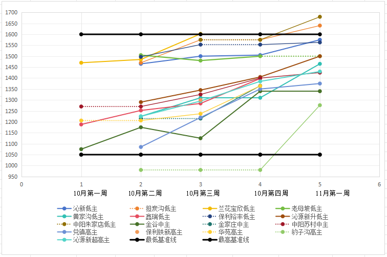 第三階段(10月第四周 - 11月第一周):呈現(xiàn)“高位沖刺” 態(tài)勢(shì),如沁新低硫主焦?jié)q至1575元/噸;中陽(yáng)朱家店低硫主焦沖至1680 元/噸;擔(dān)炭溝低硫主焦從1575元/噸躍升至1640元/噸;豹子溝高硫主焦從980元/噸沖至1276元/噸。