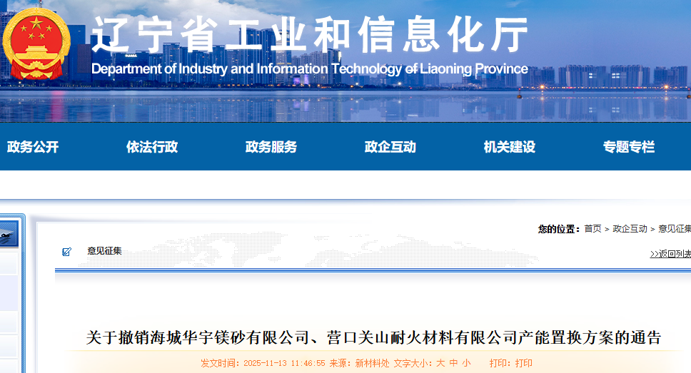 關(guān)于撤銷海城華宇鎂砂有限公司、營(yíng)口關(guān)山耐火材料有限公司產(chǎn)能置換方案的通告2025年6月19日、10月10日,我廳分別對(duì)海城華宇鎂砂有限公司、營(yíng)口關(guān)山耐火材料有限公司新建輕燒氧化鎂項(xiàng)目產(chǎn)能置換方案進(jìn)行了通告。