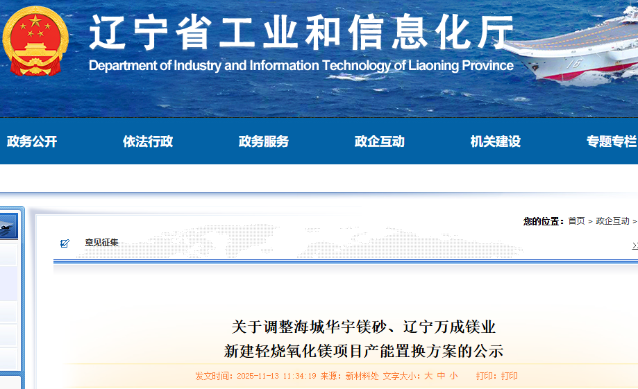 遼寧省工信廳2025年6月19日《關于海城鎂礦集團有限公司等企業(yè)新建輕燒氧化鎂項目產(chǎn)能置換方案的通告》中海城華宇鎂砂有限公司一期新建年產(chǎn)10萬噸輕燒氧化鎂懸浮窯建設項目產(chǎn)能置換方案、海城華宇鎂砂有限公司二期新建年產(chǎn)10萬噸輕燒氧化鎂懸浮窯建設項目產(chǎn)能置換方案、遼寧萬成鎂業(yè)集團有限公司年產(chǎn)20萬噸新建輕燒氧化鎂回轉窯項目產(chǎn)能置換方案擬撤銷。