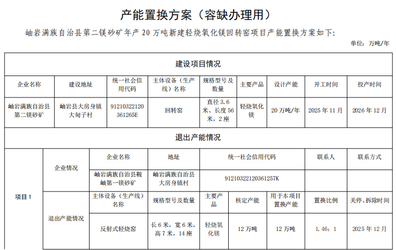 3.岫巖滿族自治縣第二鎂砂礦年產(chǎn)20萬噸新建輕燒氧化鎂回轉窯項目產(chǎn)能置換方案