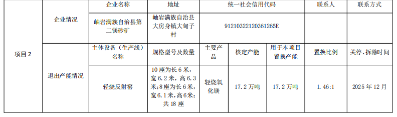 2.海城市琳麗礦業(yè)有限公司二期年產(chǎn)10萬噸輕燒氧化鎂懸浮爐項目產(chǎn)能置換方案