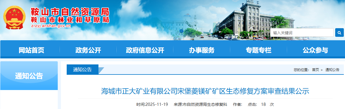 根據(jù)《遼寧省自然資源廳關于〈中華人民共和國礦產(chǎn)資源法〉實施衘接過渡期礦區(qū)生態(tài)修復方案評審工作的公告》、《遼寧省自然資源廳關于印發(fā)<礦山地質(zhì)環(huán)境保護與土地復墾方案省級審查管理辦法(試行)>的通知》(遼自然資發(fā)〔2022〕129號)有關要求,我局組織專家對《海城市正大礦業(yè)有限公司宋堡菱鎂礦礦區(qū)生態(tài)修復方案》進行了審查?,F(xiàn)將擬通過的方案及專家評審意見進行公示,公示期自發(fā)布之日起7個工作日。