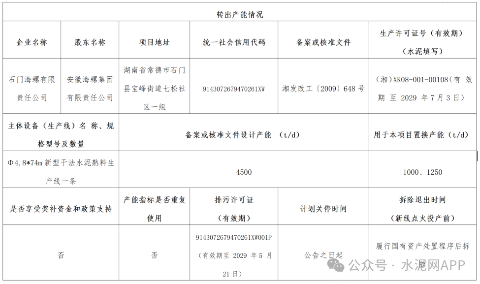 置換方案顯示,石門海螺水泥退出一條4500t/d熟料生產(chǎn)線,其中1000t/d產(chǎn)能用于補(bǔ)充英德海螺3#線,補(bǔ)充后產(chǎn)能6000t/d;1250t/d用于1#線,補(bǔ)充后產(chǎn)能5750t/d,置換比例2:1。