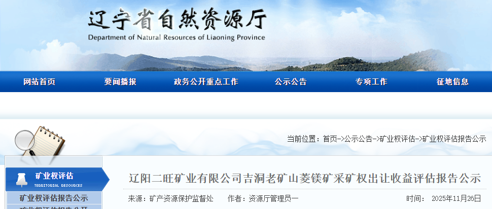 遼陽(yáng)二旺礦業(yè)有限公司吉洞老礦山菱鎂礦采礦權(quán)出讓收益評(píng)估報(bào)告通過(guò)遼寧省自然資源廳門(mén)戶(hù)網(wǎng)站向社會(huì)公示,公示10個(gè)工作日。如有異議,請(qǐng)于公示之日起10個(gè)工作日內(nèi)以電話(huà)方式先向省自然資源廳礦產(chǎn)資源保護(hù)監(jiān)督處提出簡(jiǎn)要意見(jiàn),隨后及時(shí)將書(shū)面意見(jiàn)反饋到省自然資源廳礦產(chǎn)資源保護(hù)監(jiān)督處。