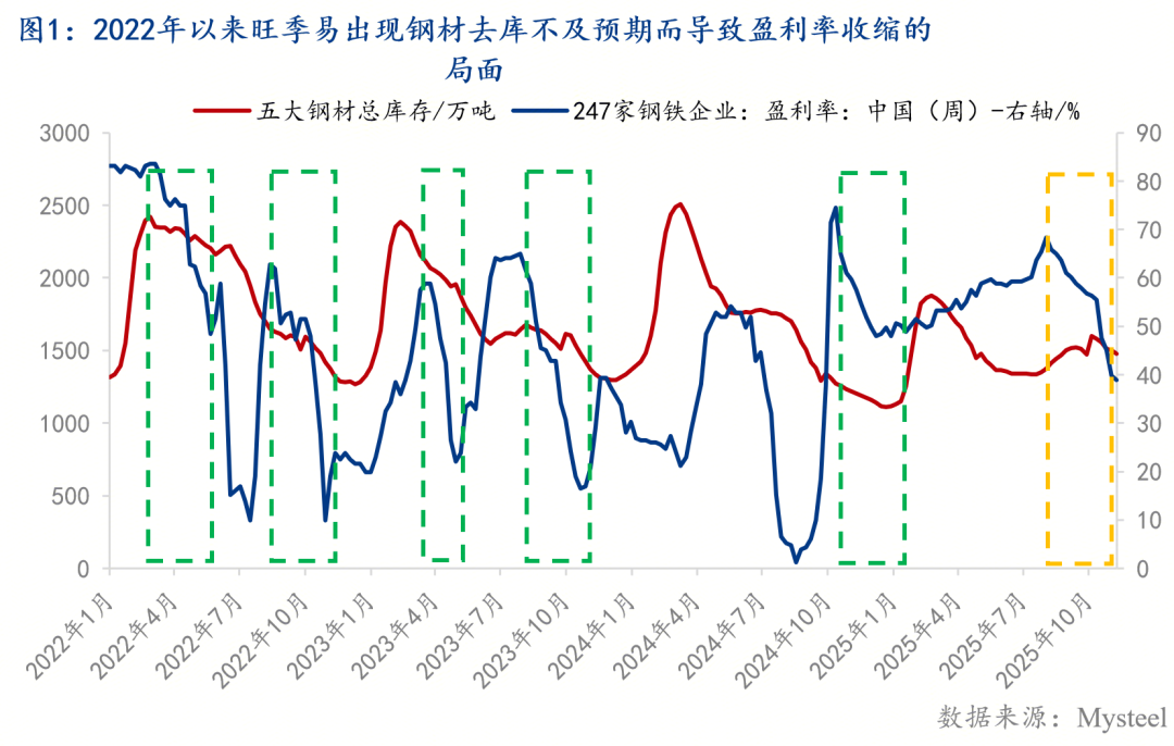 隨著金九銀十旺季逝去,鋼鐵行業(yè)在需求淡季的拖累之下,鋼材去庫壓力已然顯現(xiàn),因此負(fù)反饋邏輯成為當(dāng)前鋼市運行的主要邏輯。結(jié)合2022年以來的每年經(jīng)驗來看,鋼市負(fù)反饋行情易發(fā)現(xiàn)在旺季時段(金三銀四和金九銀十期間);那么導(dǎo)致負(fù)反饋行情最根本的原因:我們認(rèn)為在于旺季鋼材去庫不及預(yù)期(下圖1所示)。