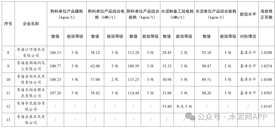 其中,青海樂都華夏水泥有限公司、青海省新型建材工貿(mào)有限責任公司兩家水泥企業(yè)能效水平達到標桿水平,其余企業(yè)為基準水平: