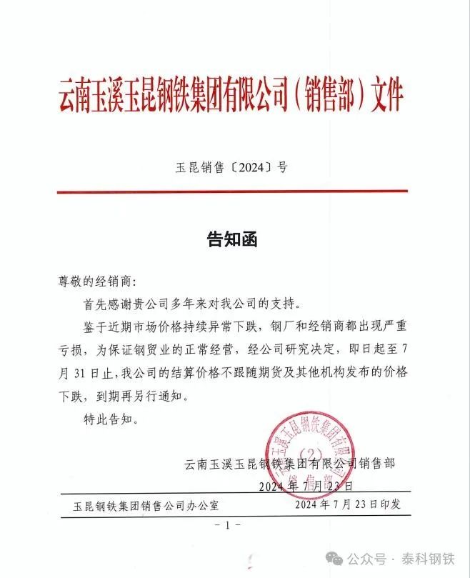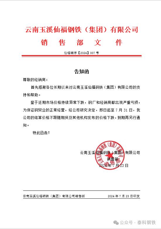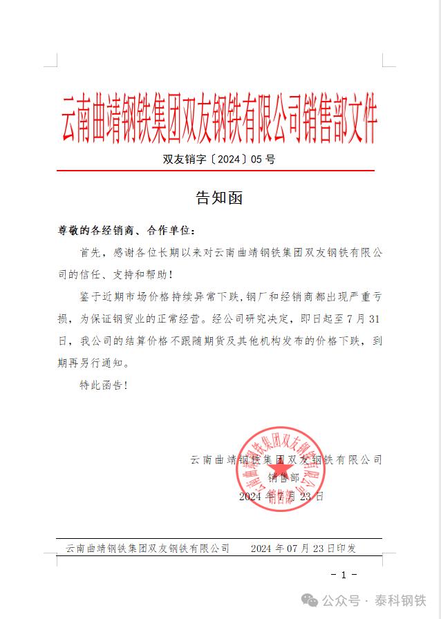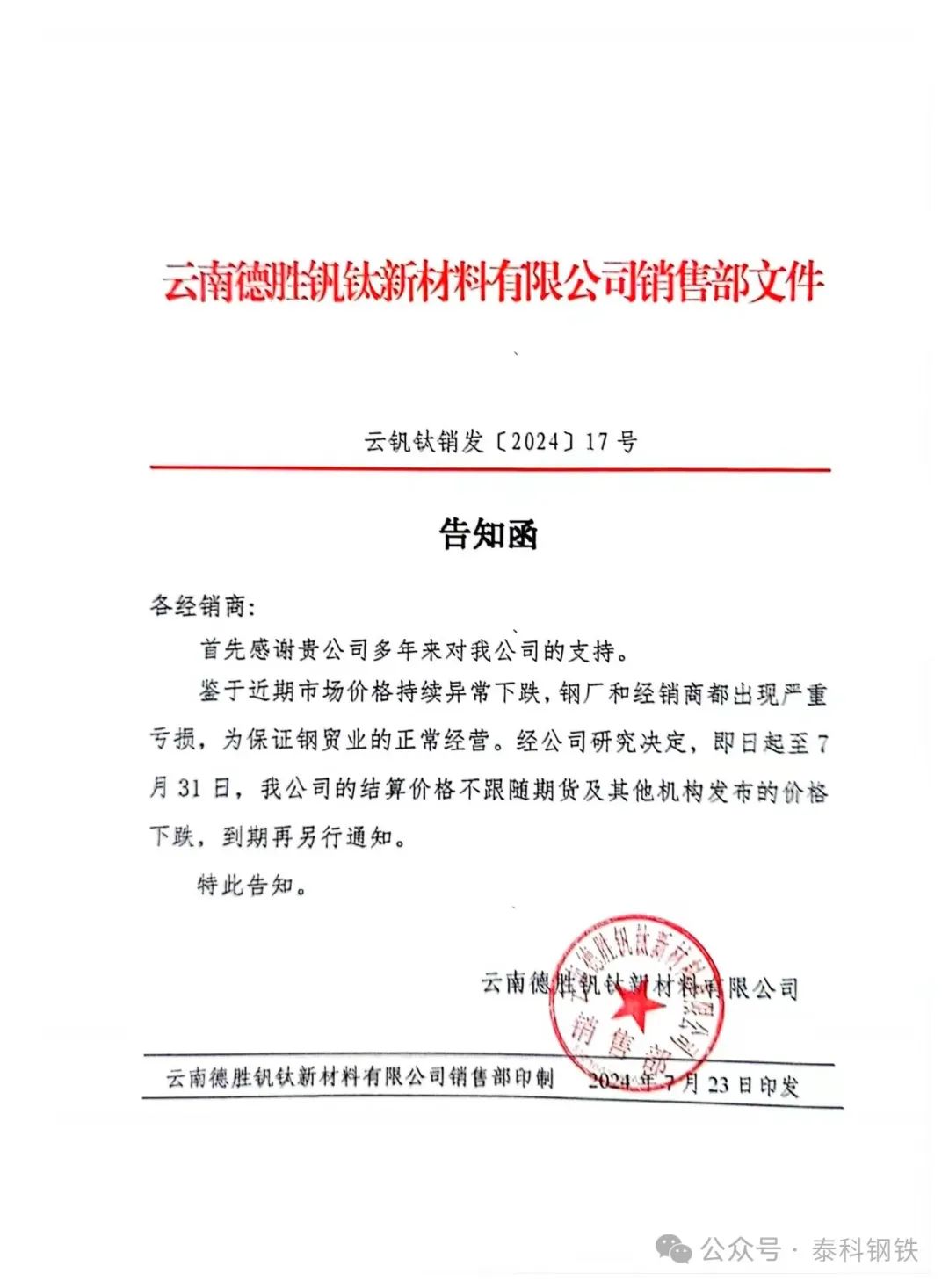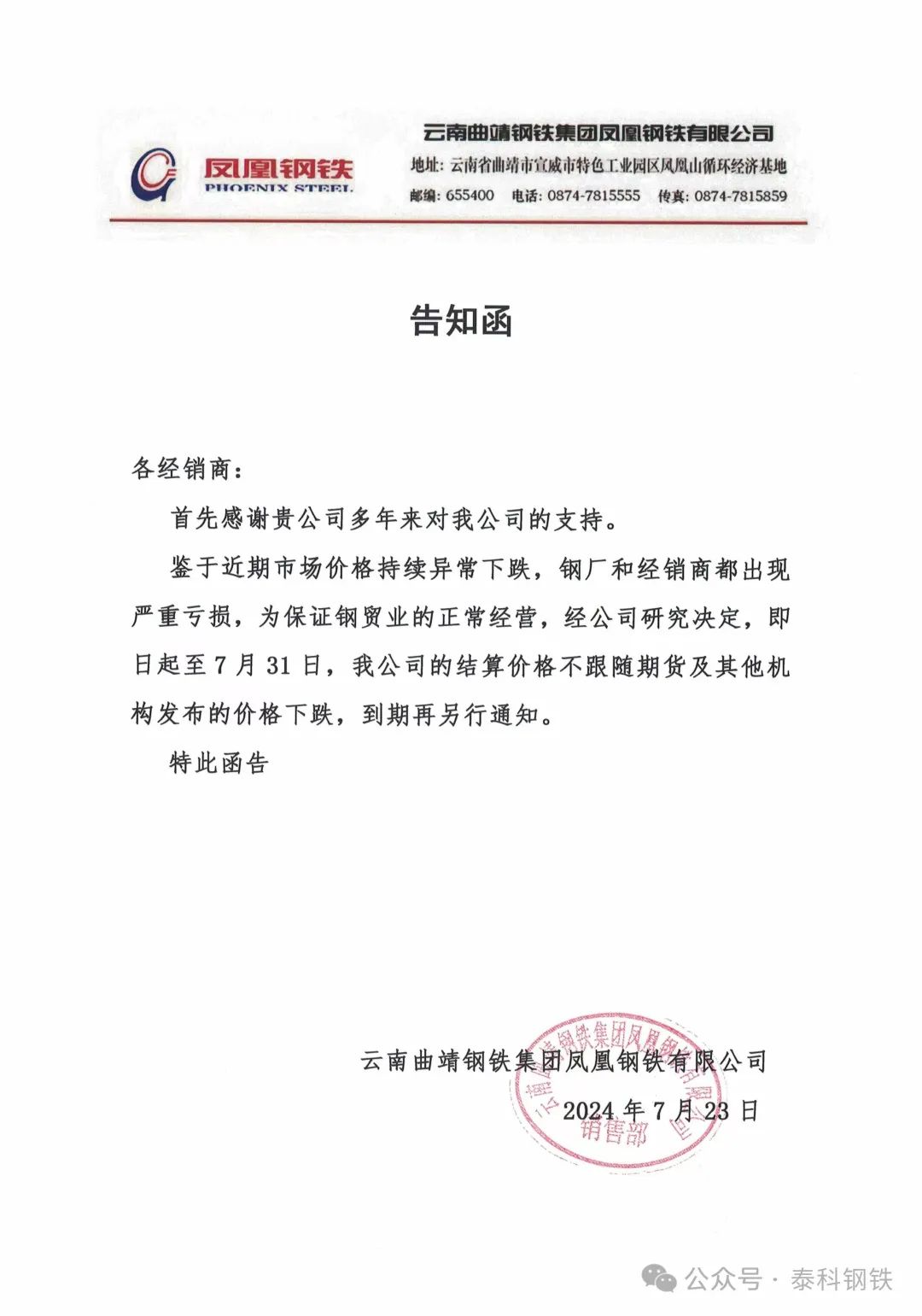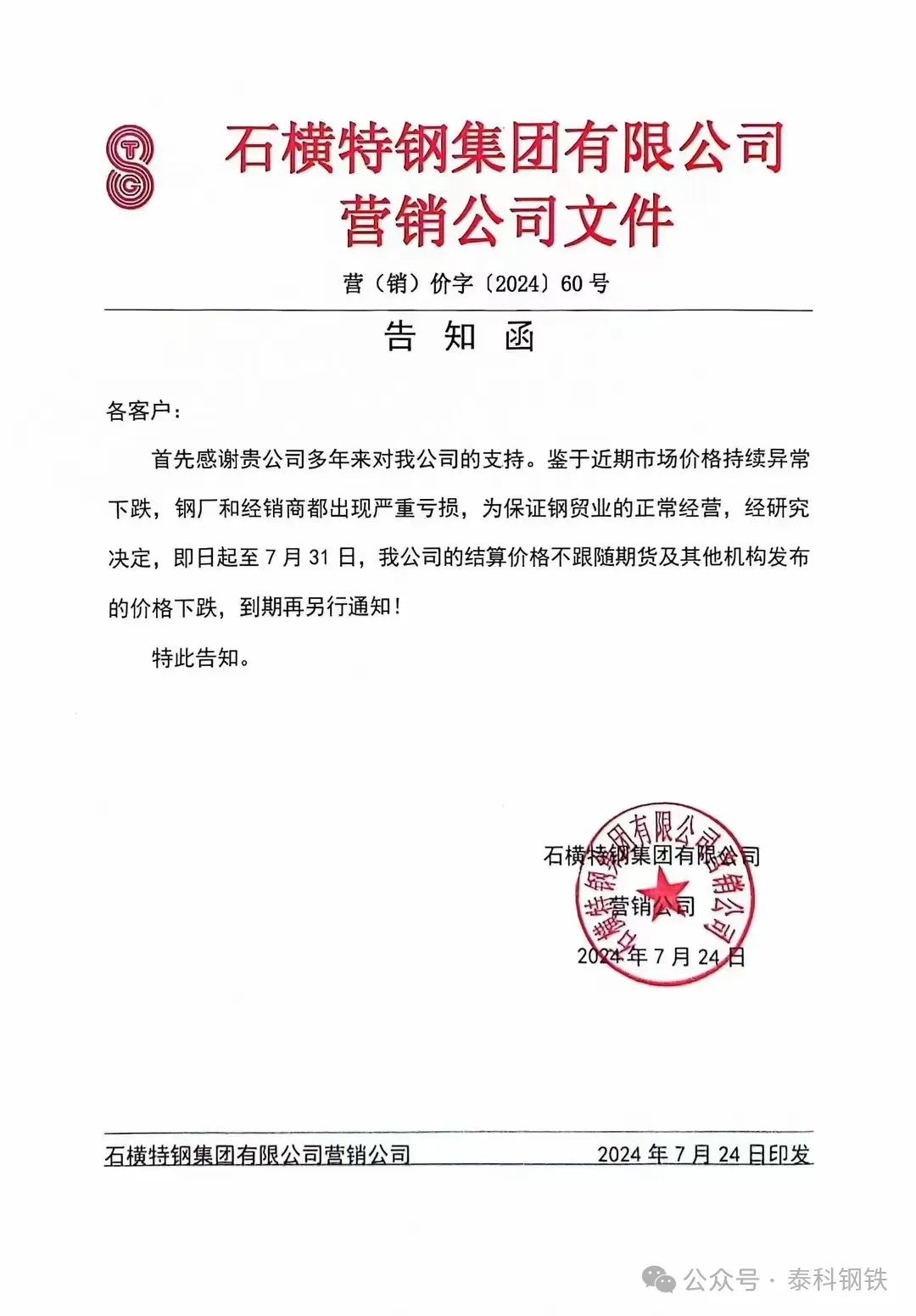 鋼廠紛紛發(fā)聲?。¤b于近期市場價格持續(xù)異常下跌,鋼廠和經(jīng)銷商都出現(xiàn)嚴(yán)重虧損,為保證鋼貿(mào)業(yè)的正常經(jīng)營,經(jīng)研究決定,即日起至7月31日,我公司的結(jié)算價格不跟隨期貨及其他機構(gòu)發(fā)布的價格下跌,到期再另行通知!