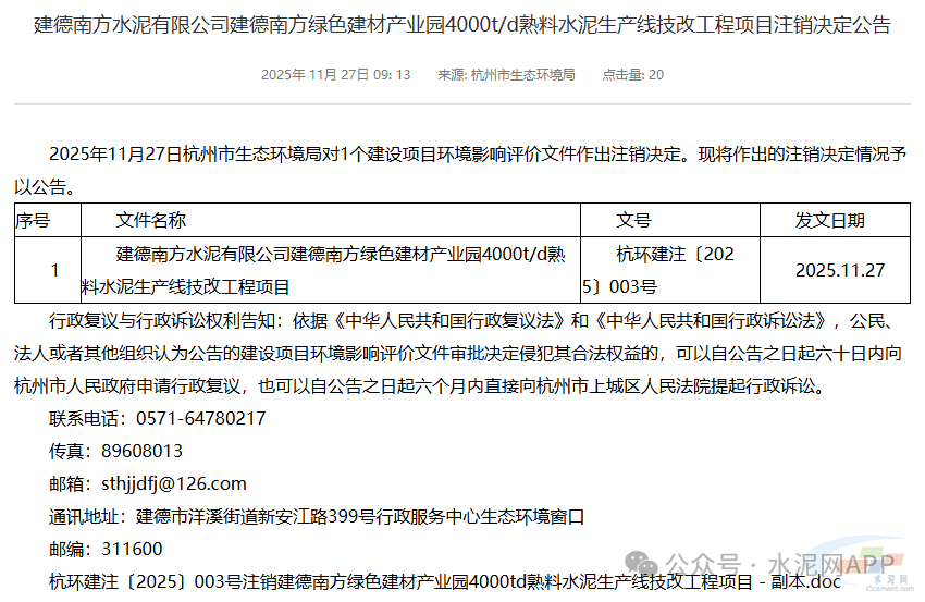 11月27日,浙江省杭州市生態(tài)環(huán)境局發(fā)布關(guān)于建德南方水泥有限公司建德南方綠色建材產(chǎn)業(yè)園4000t/d熟料水泥生產(chǎn)線技改工程項目注銷決定公告。