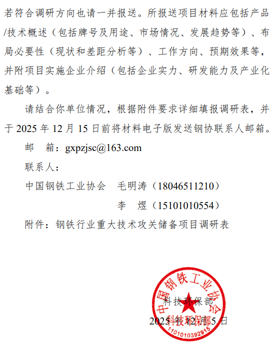 關(guān)于調(diào)研鋼鐵行業(yè)重大技術(shù)攻關(guān)儲(chǔ)備項(xiàng)目的通知