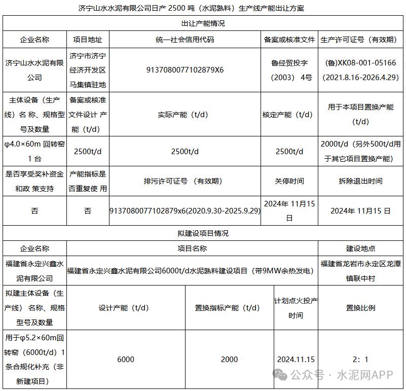 根據(jù)公示,福建省永定興鑫水泥有限公司擬在福建省龍巖市永定區(qū)龍?zhí)舵?zhèn)聯(lián)中村建設(shè)一條6000t/d水泥熟料建設(shè)項(xiàng)目(帶9MW余熱發(fā)電),置換比例2:1,計(jì)劃2024年11月15日點(diǎn)火投產(chǎn)。用于本項(xiàng)目置換產(chǎn)能為濟(jì)寧山水水泥有限公司2000t/d(另外500t/d用于其它項(xiàng)目置換產(chǎn)能)φ4.0×60m 回轉(zhuǎn)窯1臺(tái),計(jì)劃2024年11月15日拆除退出。