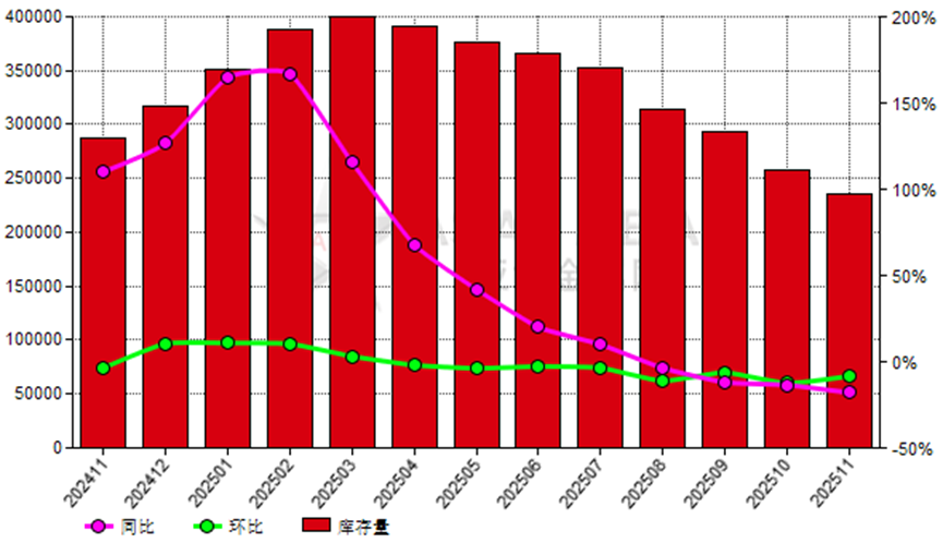 2025年1-11月,中國重燒鎂砂生產商月均庫存重燒鎂砂為338,654.55公噸,去年同期為257,390.91公噸,同比上升31.57%。