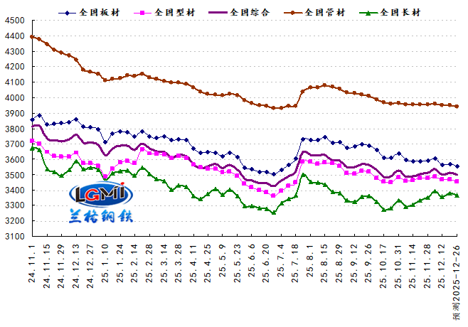 2025年第51周蘭格鋼鐵全國(guó)絕對(duì)價(jià)格指數(shù)為3514元,較上周上升0.4%,較去年同期下降5.4%;其中,蘭格鋼鐵長(zhǎng)材絕對(duì)價(jià)格指數(shù)為3382元,較上周上升0.9%,較去年同期下降4.5%;蘭格鋼鐵型材絕對(duì)價(jià)格指數(shù)為3465元,與上周持平,較去年同期下降3.6%;蘭格鋼鐵板材絕對(duì)價(jià)格指數(shù)為3570元,較上周上升0.2%,較去年同期下降6.5%;蘭格鋼鐵管材絕對(duì)價(jià)格指數(shù)為3947元,較上周下降0.1%,較去年同期下降6.0%。