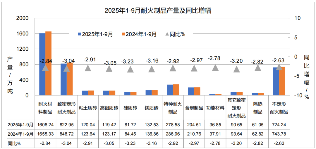 1-9月,協(xié)會(huì)同口徑統(tǒng)計(jì),全國(guó)耐火材料制品產(chǎn)量1608.24萬(wàn)噸,同比降低2.84%。其中致密定形耐火制品822.95萬(wàn)噸,同比降低3.04%;保溫隔熱耐火制品61.05萬(wàn)噸,同比降低2.82%;不定形耐火制品724.21萬(wàn)噸,同比降低2.63%,主要品種產(chǎn)量見(jiàn)圖1。
