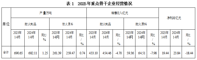 協(xié)會(huì)通過(guò)對(duì)113家重點(diǎn)耐火材料企業(yè)2025年1-9月經(jīng)營(yíng)情況調(diào)研顯示,耐火材料產(chǎn)量952.04萬(wàn)噸(含部分耐火原料),同比增長(zhǎng)1.11%;113家企業(yè)耐火制品產(chǎn)量690.65 萬(wàn)噸,同比增長(zhǎng)1.25 %。耐火材料銷(xiāo)售總收入492.46億元,同比降低5.11 %;剔除原料,其中耐火制品銷(xiāo)售總收入433.10億元,同比降低4.70%。113家企業(yè)實(shí)現(xiàn)利潤(rùn)19.44 億元,同比下降18.44%,銷(xiāo)售利潤(rùn)率約3.95%;上繳稅金25.50億元,同比下降4.00%。表1列出了上述調(diào)查情況。