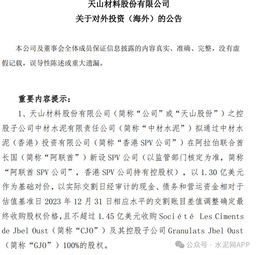 天山股份7月26日晚間公告,公司控股子公司中材水泥擬通過其全資子公司香港SPV公司在阿聯(lián)酋新設(shè)阿聯(lián)酋SPV公司,并引入其他投資人,以阿聯(lián)酋SPV公司為主體收購(gòu)?fù)荒崴笴JO及其所屬GJO公司100%的股權(quán)。