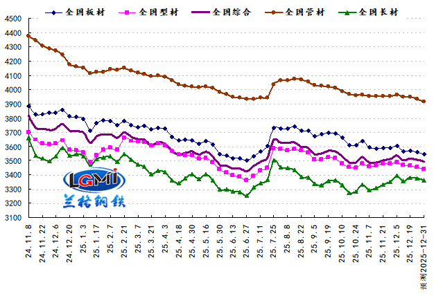 2025年第52周(2025.12.22-12.26)蘭格鋼鐵全國(guó)絕對(duì)價(jià)格指數(shù)為3505元,較上周下降0.3%,較去年同期下降5.6%;其中,蘭格鋼鐵長(zhǎng)材絕對(duì)價(jià)格指數(shù)為3377元,較上周下降0.2%,較去年同期下降4.9%;蘭格鋼鐵型材絕對(duì)價(jià)格指數(shù)為3453元,較上周下降0.4%,較去年同期下降3.3%;蘭格鋼鐵板材絕對(duì)價(jià)格指數(shù)為3560元,較上周下降0.3%,較去年同期下降6.6%;蘭格鋼鐵管材絕對(duì)價(jià)格指數(shù)為3931元,較上周下降0.4%,較去年同期下降5.7%。