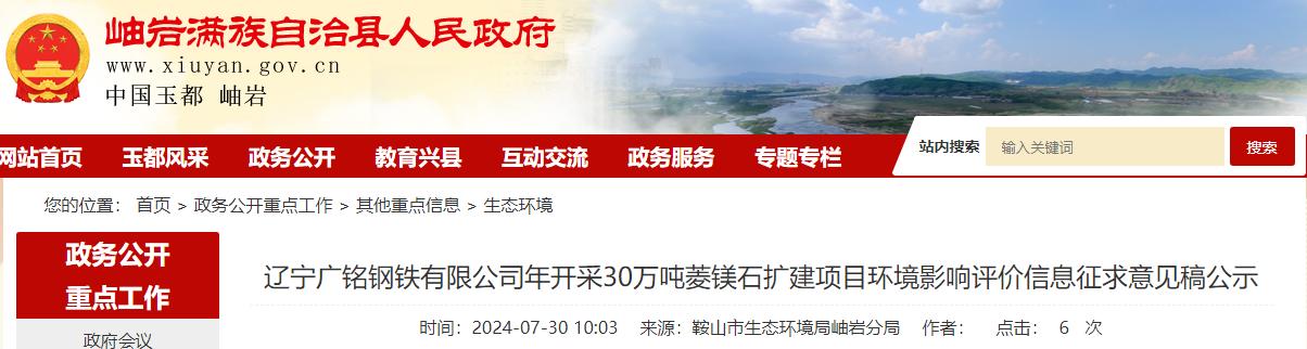 遼寧廣銘鋼鐵有限公司年開(kāi)采30萬(wàn)噸菱鎂石擴(kuò)建項(xiàng)目已委托沈陽(yáng)東環(huán)環(huán)境咨詢(xún)有限公司開(kāi)展環(huán)境影響評(píng)價(jià)工作,現(xiàn)按照《環(huán)境影響評(píng)價(jià)公眾參與辦法》(生態(tài)環(huán)境部令 第4號(hào))等法律法規(guī)文件要求,對(duì)該項(xiàng)目建設(shè)基本情況及公眾參與形式等信息公告如下,望廣大公眾積極參與,對(duì)項(xiàng)目的建設(shè)提出寶貴意見(jiàn)。