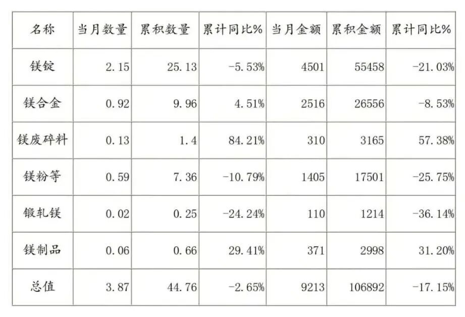 核心結論:鎂合金、鎂廢碎料、鎂制品的增長,反映市場對高附加值、再生資源類產品的需求提升;而鎂錠、鎂粉等基礎品類的下滑,體現(xiàn)傳統(tǒng)出口市場的需求萎縮。