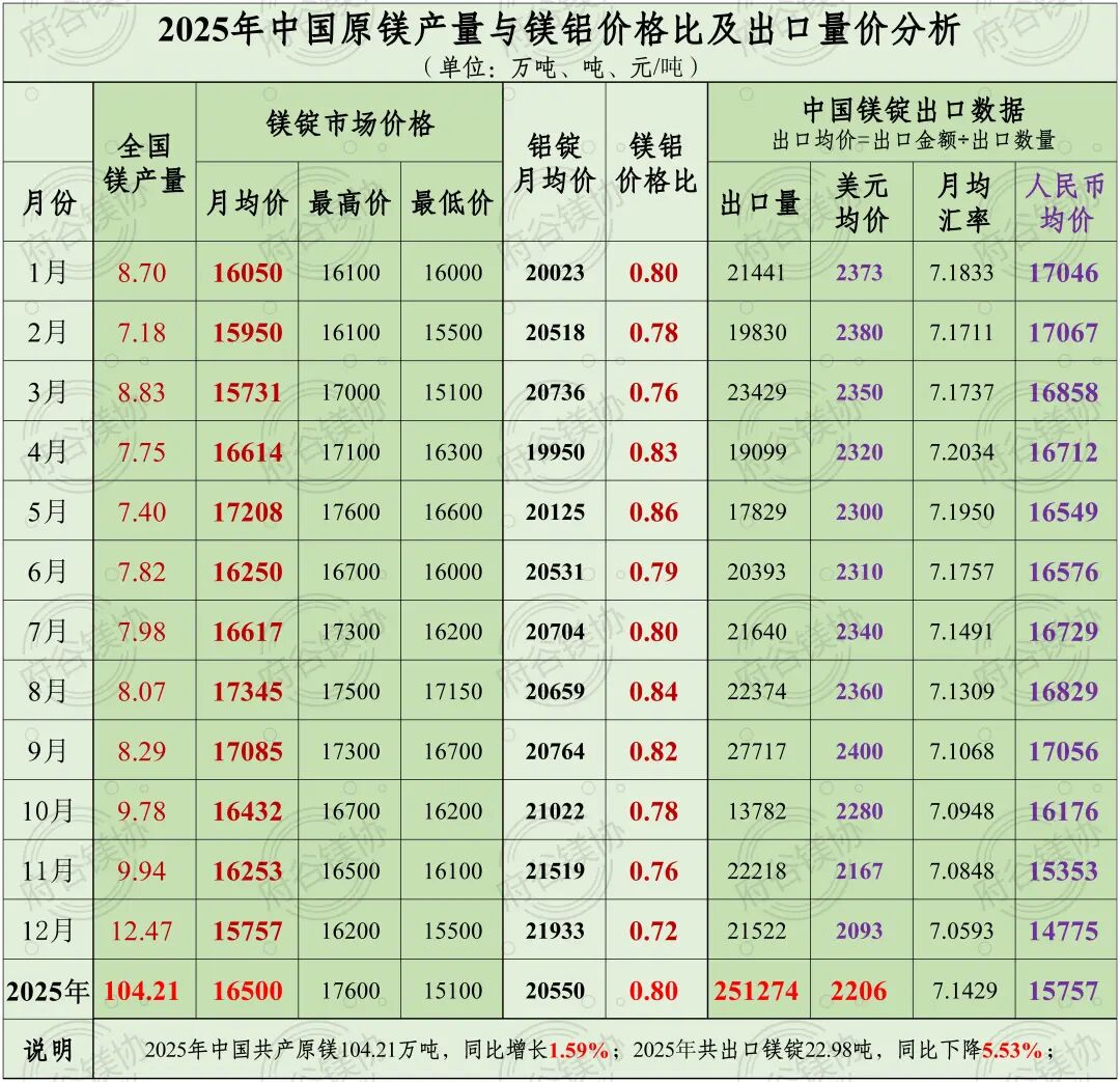 從行業(yè)核心運行指標分析,2025年原鎂市場呈現(xiàn)產量增長、鎂鋁比價走弱的特征,疊加匯率波動影響,原鎂出口端面臨多重壓制,行業(yè)競爭格局進一步承壓。