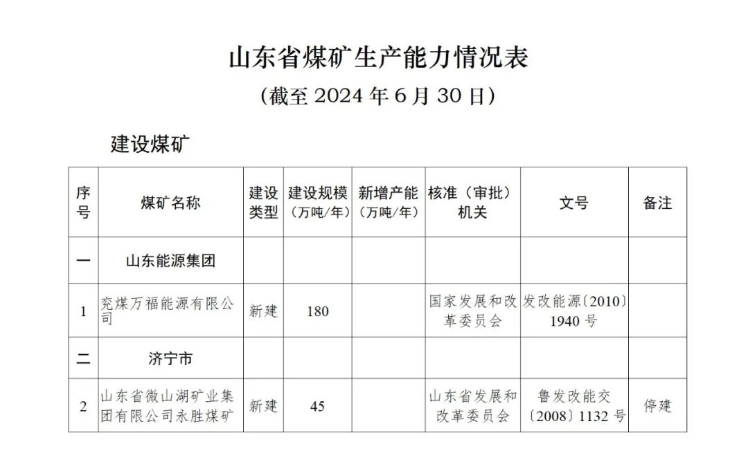 截至2024年6月30日,山東省有依法生產(chǎn)建設煤礦84處,產(chǎn)能規(guī)模12163萬噸/年。其中,建設煤礦2處,建設規(guī)模225萬噸/年;生產(chǎn)煤礦82處,登記生產(chǎn)能力11938萬噸/年。