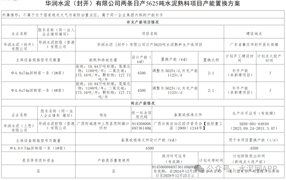 置換方案顯示,華潤水泥(上思)公司退出一條4500t/d熟料生產(chǎn)線,產(chǎn)能用于補充華潤水泥(封開)公司3#、4#兩條4500t/d熟料線,補齊后兩條線產(chǎn)能為5625t/d,置換比例2:1。
