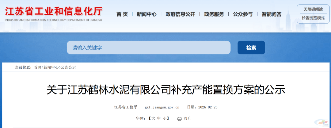 現(xiàn)將江蘇鶴林水泥有限公司補充產(chǎn)能置換方案予以公示,歡迎社會公眾進行監(jiān)督。公示時間為2026年2月25日至3月9日。公示期間如有異議,請以書面形式向江蘇省工業(yè)和信息化廳反映情況。