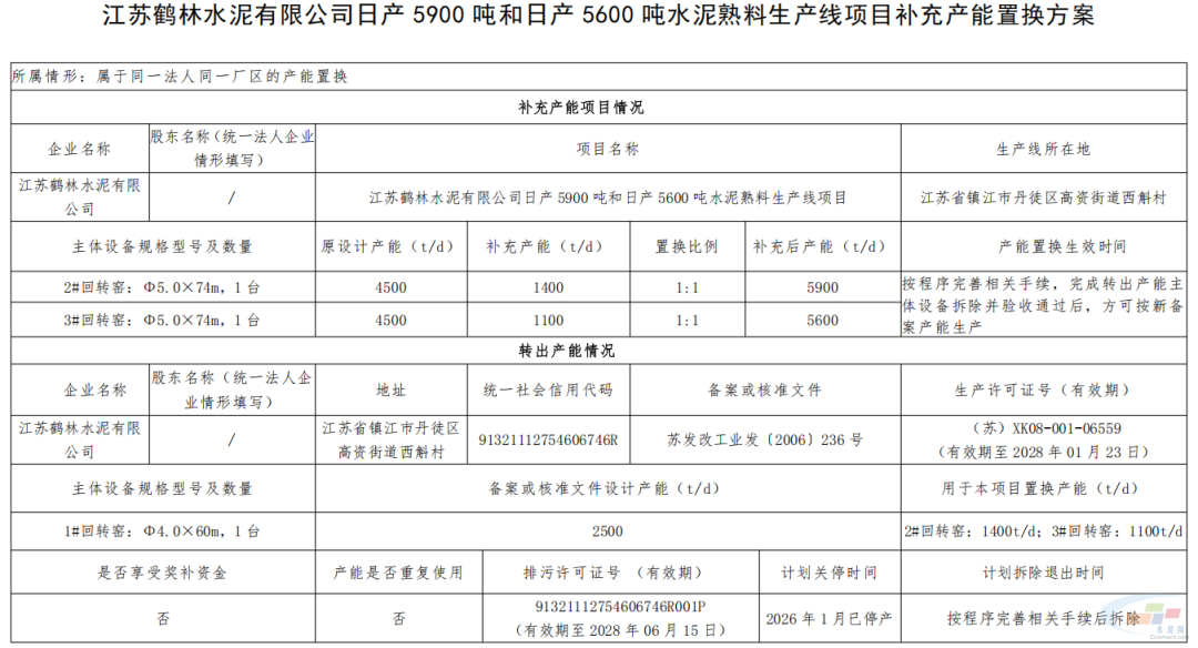 附件:江蘇鶴林水泥有限公司日產(chǎn)5900噸和日產(chǎn)5600噸水泥熟料生產(chǎn)線項目補充產(chǎn)能置換方案