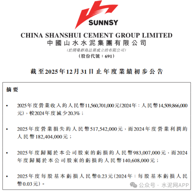 3月4日晚間,山水水泥公布2025年業(yè)績(jī),營(yíng)業(yè)收入約人民幣115.61億元,較2024年度減少20.3%;歸屬于公司股東的虧損約9.83億元,2024年度虧損約1.41億元。公告稱,收益減少主要由于本年度水泥銷量同比減少14.9%及價(jià)格同比下降4.7%所致。虧損主要由于水泥受市場(chǎng)需求疲弱,價(jià)量齊跌,營(yíng)業(yè)毛利下滑,及停產(chǎn)企業(yè)或產(chǎn)線相關(guān)廠房設(shè)備等固定資產(chǎn)估列減值損失增加,全年度虧損較去年同期增加9.02億元。