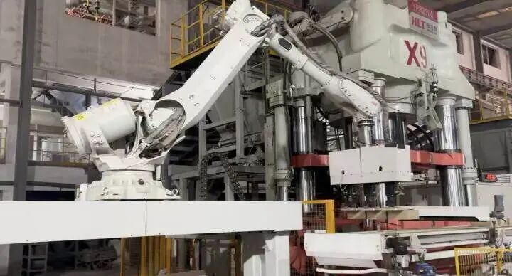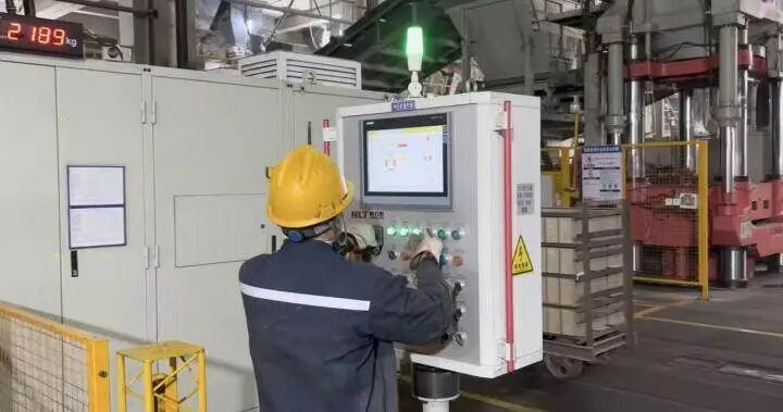 在半成品鍛造車間,機器轟鳴聲中,半成品工段段長張賀一邊帶著記者查看生產(chǎn)線,一邊現(xiàn)場介紹?!霸蹅冃吕仙a(chǎn)線加起來一共22臺壓機,其中有4臺是德國生產(chǎn)的萊式液壓機,剩下的是國產(chǎn)恒力泰液壓機?!睆堎R指著正在運行的設(shè)備對記者說,“不同機型搭配使用,既能保證壓制精度,又能滿足大批量生產(chǎn)的需求?!?
